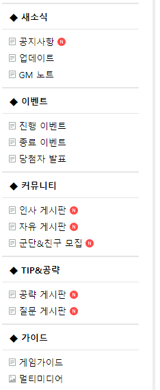 공지사항, 업데이트, GM 노트, 이벤트 등등 운영진이 제공하는 게시판과